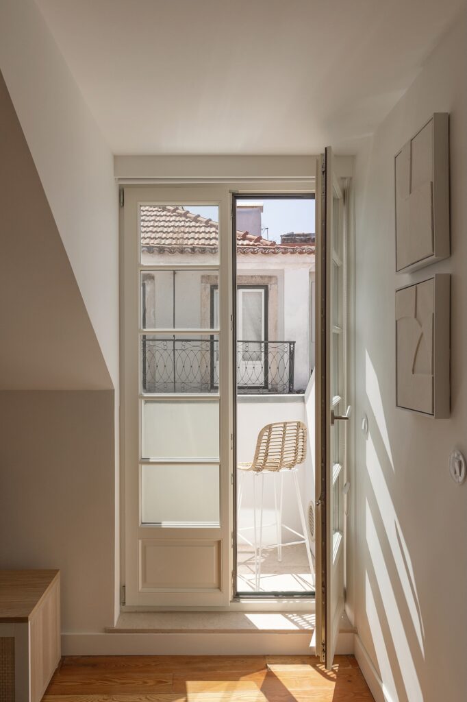 Um apartamento num prédio Pombalino totalmente remodelado, com cerca de 40 m2, com um pé direito relativamente pequeno e esconço. O quarto apesar de ter cerca de 10m2 aparenta ser mais pequeno pelo facto de ser esconço.