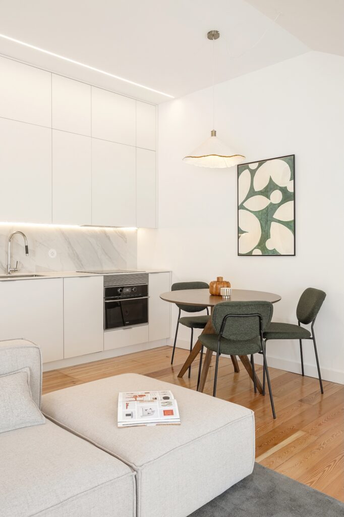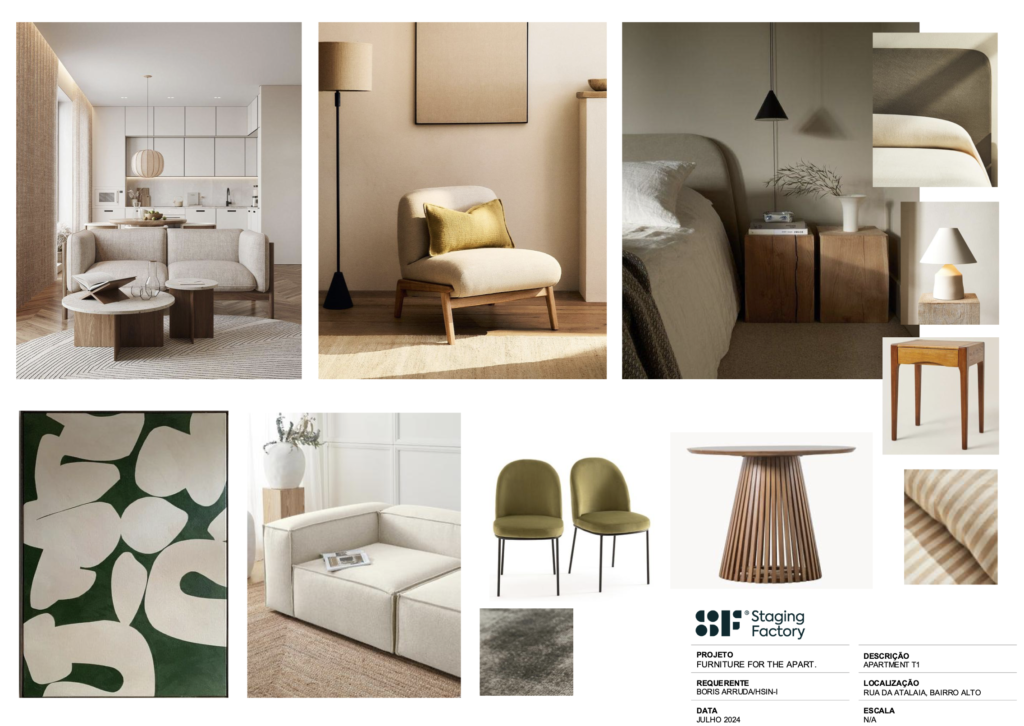 O apartamento foi totalmente mobiliado e decorado com base numa paleta de cores brancas e com apontamentos de cor verde para tornar o ambiente mais convidativo e sedutor. A aposta em elementos diferenciadores e peças personalizadas como o candeeiro suspenso e a pintura de autoria @e_t_in_lisbon foram apostas para criar um ambiente sedutor e acolhedor que captasse o olhar dos potenciais clientes que valorizam ambientes com design. A proposta incluiu o desenvolvimento criativo do projeto, pesquisa, seleção e compra de todos os móveis, materiais e acessórios de decoração. Também incluiu a gestão de todas as entregas, montagens e decoração e produção fotográfica final.